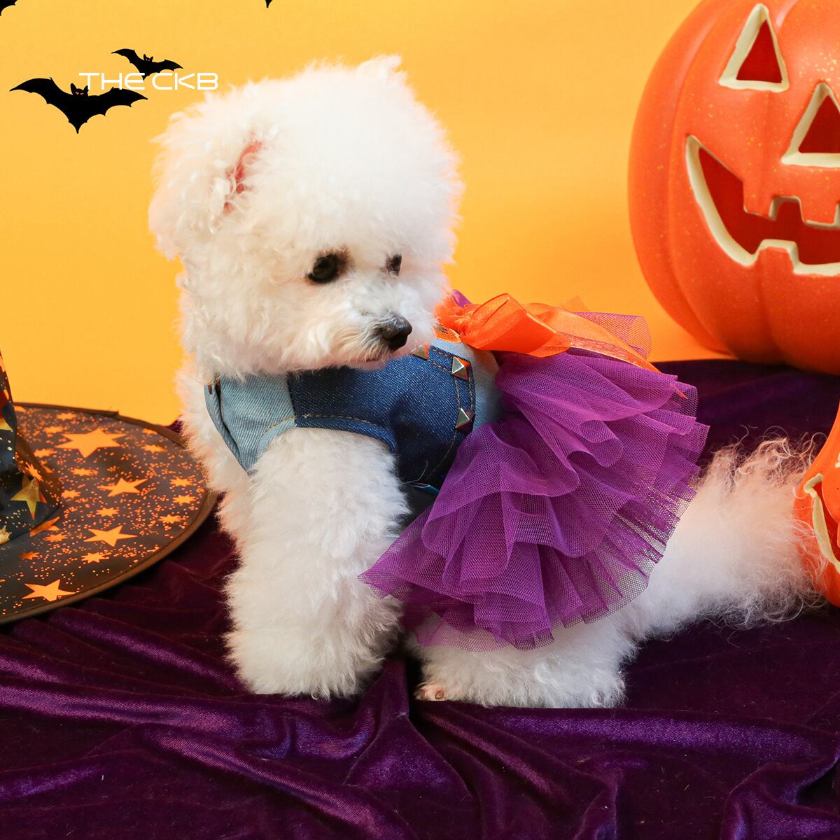 2色切り替えのデニム部分にスタッズ、大きなリボン、紫のボリュームのあるチュチュが可愛らしいアイテムです♡