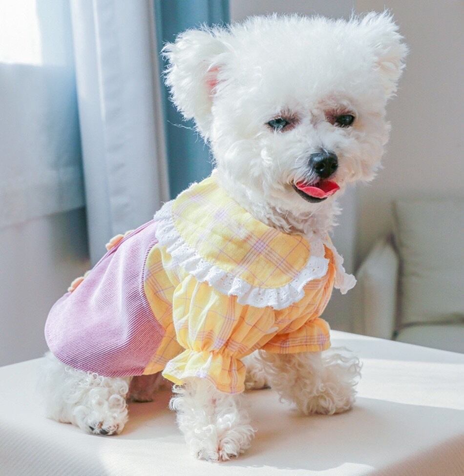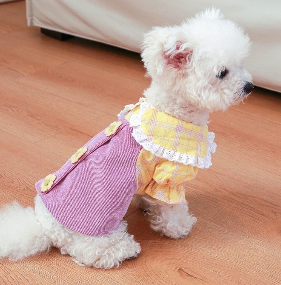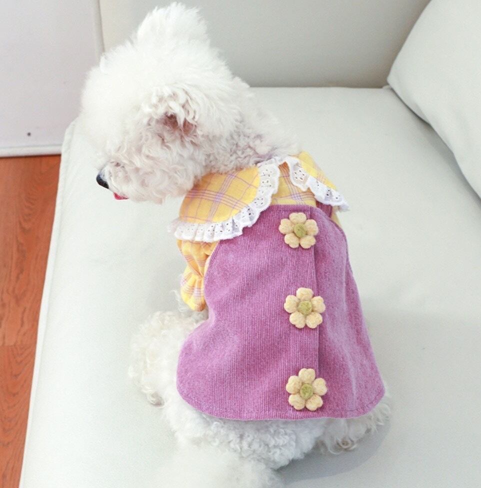 イエローのチェックとお花がポイントのワンピース!!丸襟にもレースがついているのでとってもキュートです!前ボタンなので脱ぎ着しやすいのもポイント♡